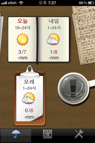 또하나 유용한것이 컵버튼을 누르면 오늘 내일 모레에대한 날씨 관련 모든 정보가 보여집니다.